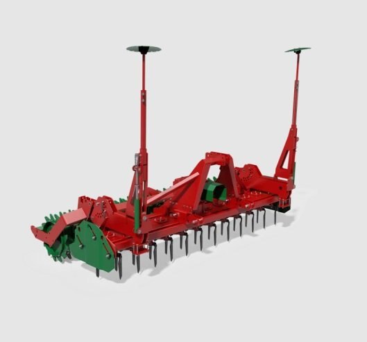 A specially designed map of the tooth system (the angle of work of subsequent rotors with teeth relative to each other) gives the user an optimal starting position, which in turn can translate into perfect breakdown of soil lumps. The gap between the teeth guarantees quiet work without clogging. The system of gears forming gears driving teeth and positioning bearings is very precise. Its long life is guaranteed by the cassette sealing system. As standard, the active harrow has side screens mounted on springing handles. The screens limit the radius at which the soil is thrown, thus preventing the formation of ridges at the junction of passages.