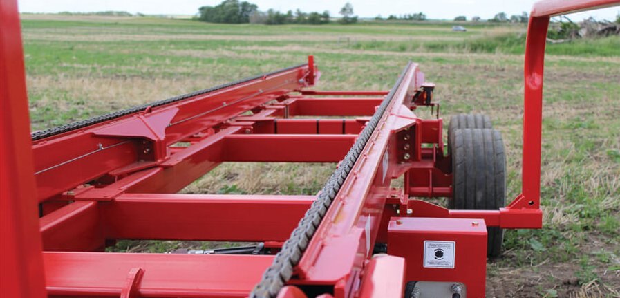 From the cab of the tractor, the deck is lifted hydraulically. The bale chains transfer the bales onto the ground without ripping twine or damaging the bales.The tail of the Bale Mover is designed to skid over the ground during the unloading process without damage.