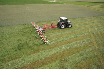 With the trailed configuration, high outputs are possible even with small tractors. The trailed tedders offer working widths (DIN) of 5,20 m / 7,85 m / 8,60 m without the need for lifting power.