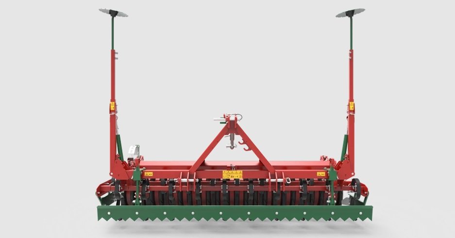 The combination of a top-mounted seed drill with different types of aggregates allows for the perfect selection of a seedbed combination for each type of soil. Choose a set that perfectly fits your farm. You can also use the seeder for sowing catch crops. This compact seedbed combination is characterized by a very good weight distribution. Technologists and designers have devoted a lot of attention to designing a suitably light set, with a compact structure and center of gravity as close as possible to the tractor. The developed structure makes it possible to aggregate the cultivating and sowing set with tractors of relatively low power