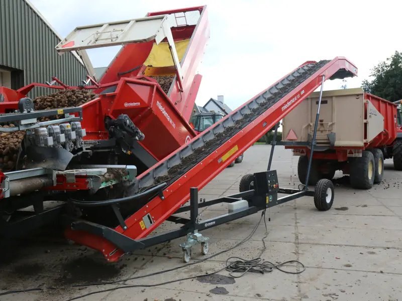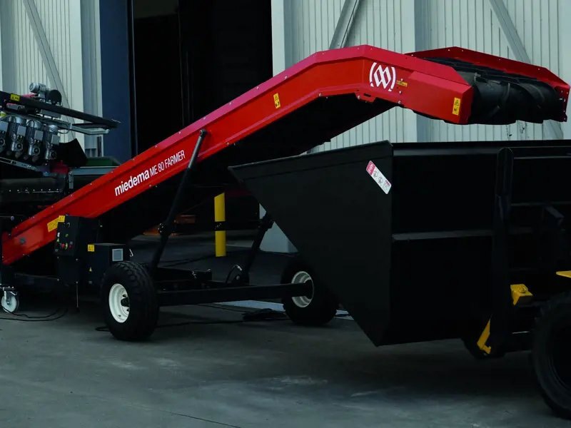 The Miedema ME-elevator conveyors are the best suited belt conveyors for the filling of your store with a capacity of more than 160 tonnes/hour. The lifting elevators can also be used for the transport of waste from a receiving hopper. The heavy-duty frame turns the ME elevator conveyors into very sturdy machines. The ME series is characterised by an 80 or 100 cm wide troughed conveyor belt and is available in lengths of 8 or 10 m. The ME series is characterised by a large discharge height and a nodding section.